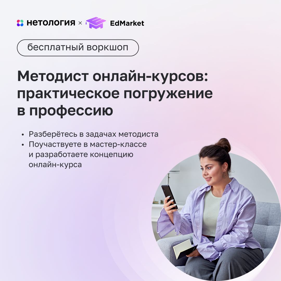 Если вы хотите попробовать себя в роли этого специалиста, приходите на двухдневный онлайн-воркшоп «Методист онлайн-курсов: погружение в профессию». В первый день вы изучите теорию и узнаете, какие навыки нужны для старта в профессии. Во второй день — приступите к практике: поучаствуете в мастер-классе и разработаете концепцию онлайн-курса в программе Miro. А ещё: