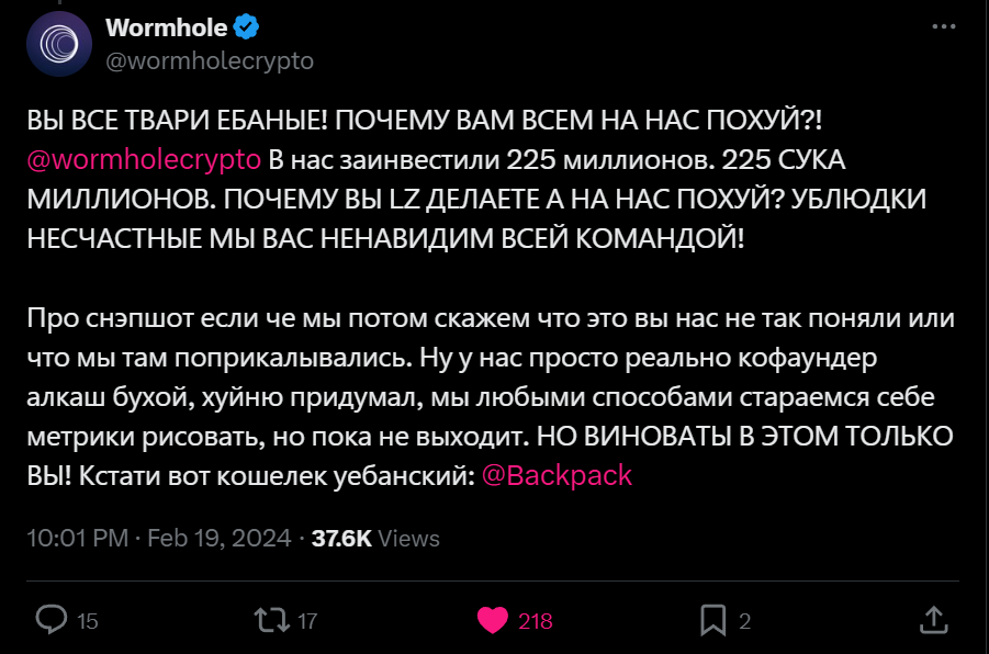 Wormhole молодцы, захотели выделиться среди остальных проектов и сделали максимально тупорылый мув. Я очень рад что криптоВаси2004 до сих пор радуются и говорят что они смарт типы и вынесли вормхол со своей приваткой, но есть одно но!