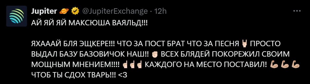Да, Кристина, пост то я выложу, спасибо за такой фидбек к ласт посту, но ты понимаешь что на 8 марта завтра ты не получишь цветы потому что я нахуй всё вьебу в аккаунты паркла и голосования на юпитере? ТЫ ПОНИМАЕШЬ ЭТО? В следующий раз попрошу быть более политкорректной, я криптовалютный магнат и локальный медиа инфлюенсер.