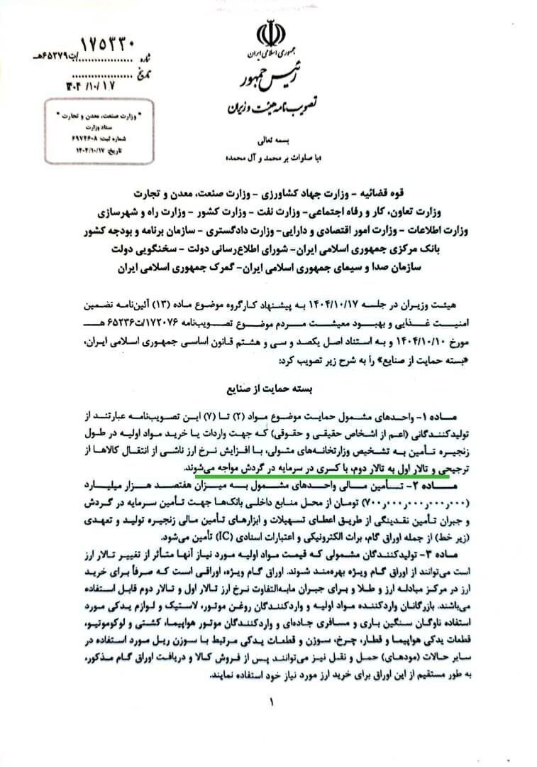 👈 مصوبه جدید هیات وزیران (مورخ 1404/10/17 )، در واقع همان بستۀ حمایتی دولت از صنایع و واحدهای تولیدی است که شامل ۷ بند بوده و هدف اصلی آن حمایت از واحدهای تولیدی درگیر در فرآیند تولید اعلام شده است.