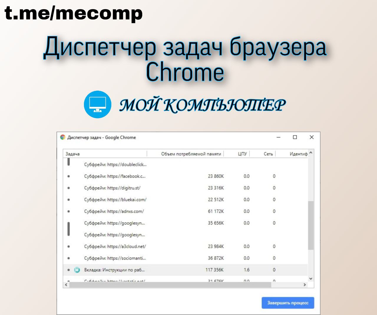 У браузера Google Chrome есть свой собственный диспетчер задач как у полноценных ОС. Он позволяет руководить процессами в самом браузере, например: закрывать ресурсоёмкие задачи, чтобы освободить оперативную память.