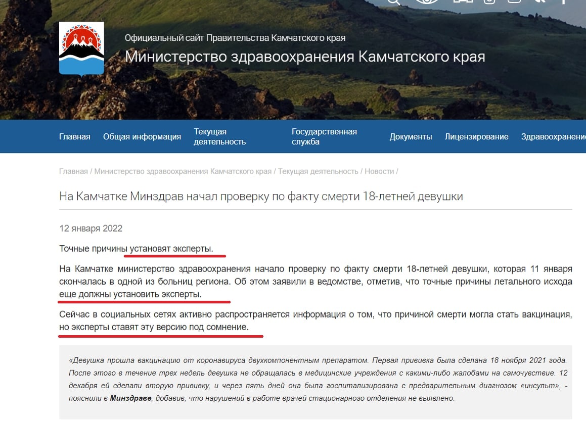 В ведомстве заявляют, что выводы о связи Спутника V со смертью девушки преждевременные, а точную причину ещё должны установить эксперты. При этом камчатский минздрав тут же в своём официальном сообщении ссылается на специалистов, которые уже ставят эту версию о связи вакцинации и смерти под сомнение. Какие именно эксперты — в региональном минздраве не сообщают.