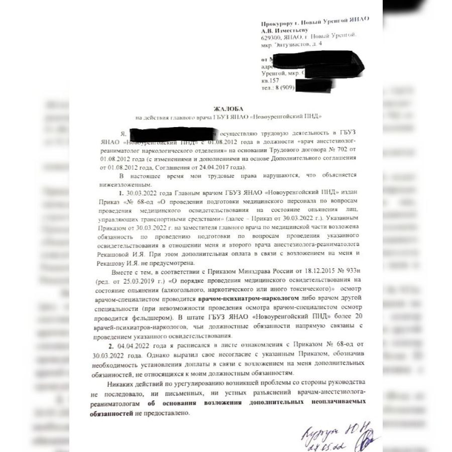 Так, анестезиологи-реаниматологи наркологического отделения, высказавшие свое мнение в отношении происходящего, незамедлительно получили письменные уведомления об их сокращении. Стоит отметить, что речь идет о двух врачах высшей категории со стажем более 20 лет. Медики были вынуждены обратиться в Прокуратуру г. Новый Уренгой с жалобой на действия Кривогузова.