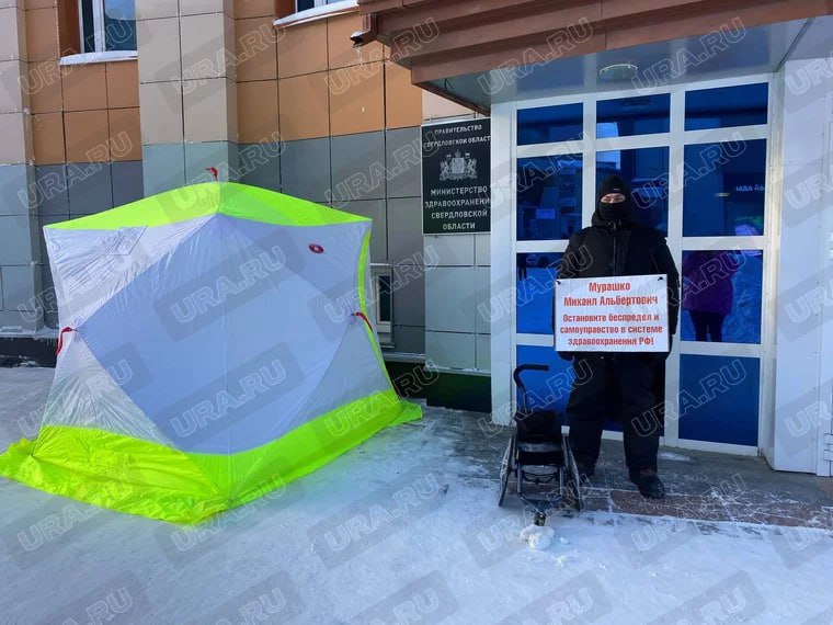 Несмотря на это, отец мальчика Дмитрий Бахтин поставил палатку около входа в здание свердловского минздрава.