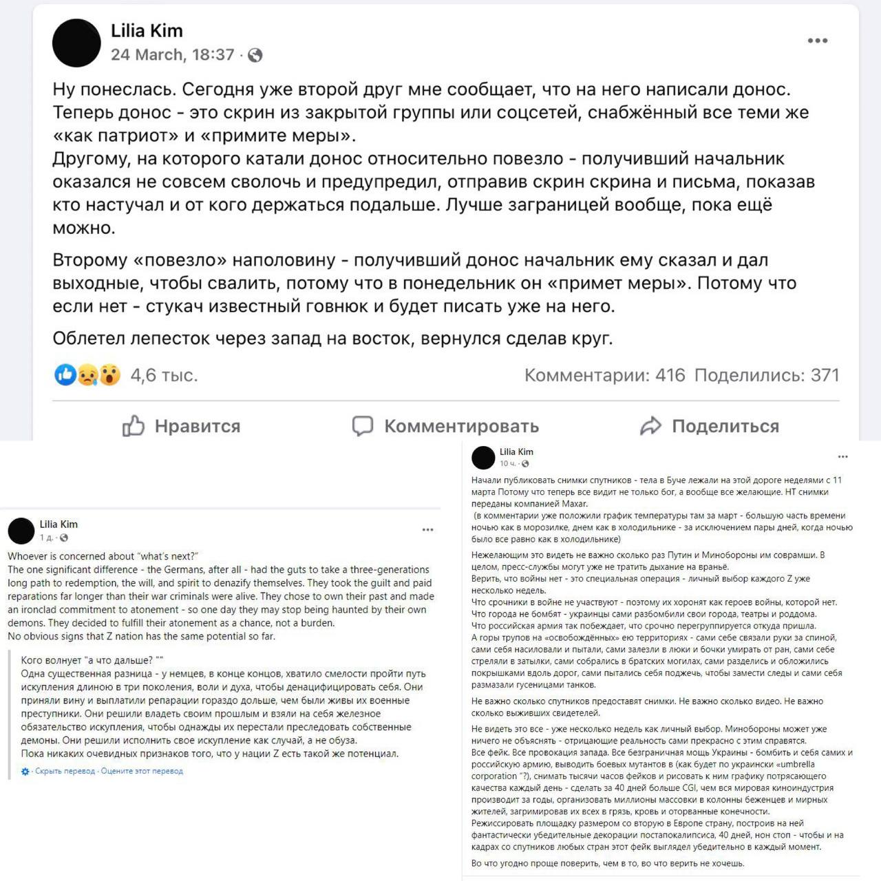 Эмиграция и экзотичное происхождение не сделали Ким счастливей. И в этом кто-то должен быть виноват. Не сама же Ким, и не Америка с американцами. Виноватые нашлись 24 февраля, это оказались Россия, русские, Владимир Путин и Победа в Великой Отечественной войне. Дня не прошло, с начала СВО, чтобы сценаристка-неудачница не написала какой-нибудь пост, полный ксенофобии, расизма и разжигания межнациональной ненависти. Для украинцев она теперь прям звезда - россиянка, которая не боится говорить правду, которую она по факту сама же и придумывает, слушая голоса в своей голове.