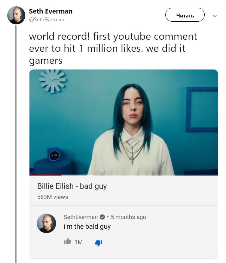 YouTube впервые наградил пользователя за достижение миллиона лайков на комментарии — видеоблогер, музыкант Сет Эферман в мае первым прокомментировал клип Bad Guy Билли Айлиш. Эферман написал «I’m the bald guy», (я лысый парень) и он в самом деле лысый парень.