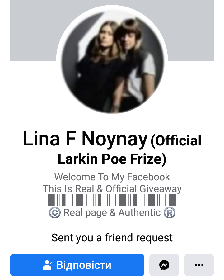 Нещодавно в фейсбуці мені надіслали запит зі сторінки, що називалася "Larkin Poe". На ній була світлина Ребекки і Меган Ловел і репости зі сторінки справжніх Larkin Poe за останній місяць, зроблені одразу після створення цього фейку. Я здивувався, навіщо так шахраювати, ще й настільки тупо, поскаржився в службу підтримки, і через кілька годин воно зникло.