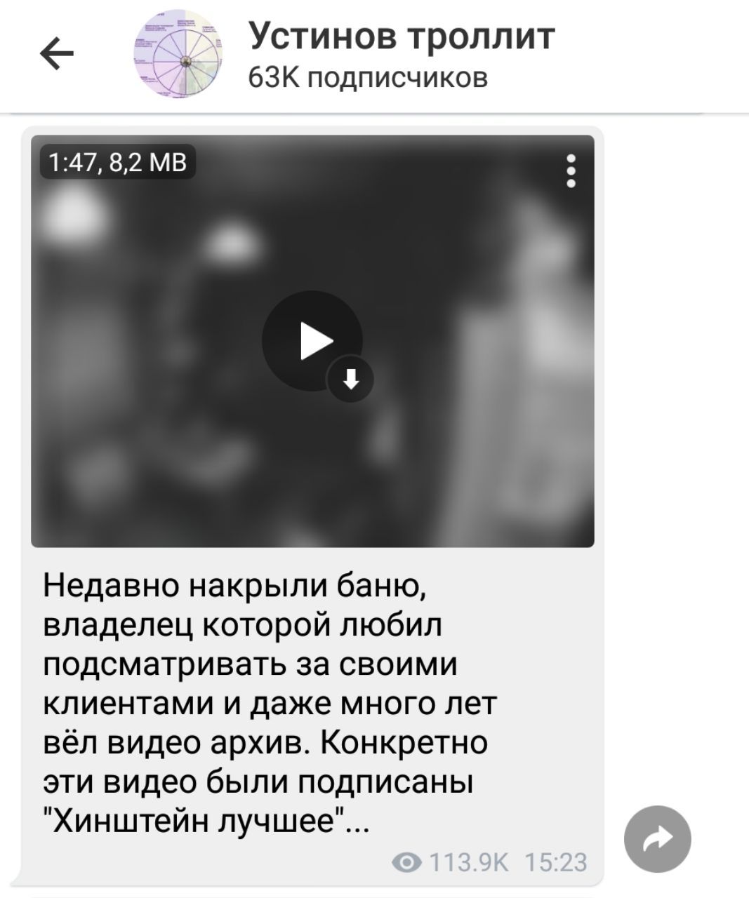 По Телеграму распространяется фейк 8-летней давности о депутате Госдумы Хинштейне. По сообщению канала "Устинов троллит", "недавно накрыли баню", на съёмке скрытой камерой в которой депутат якобы принимает участие в групповом бисексуальном сексе с примесью различных извращений.