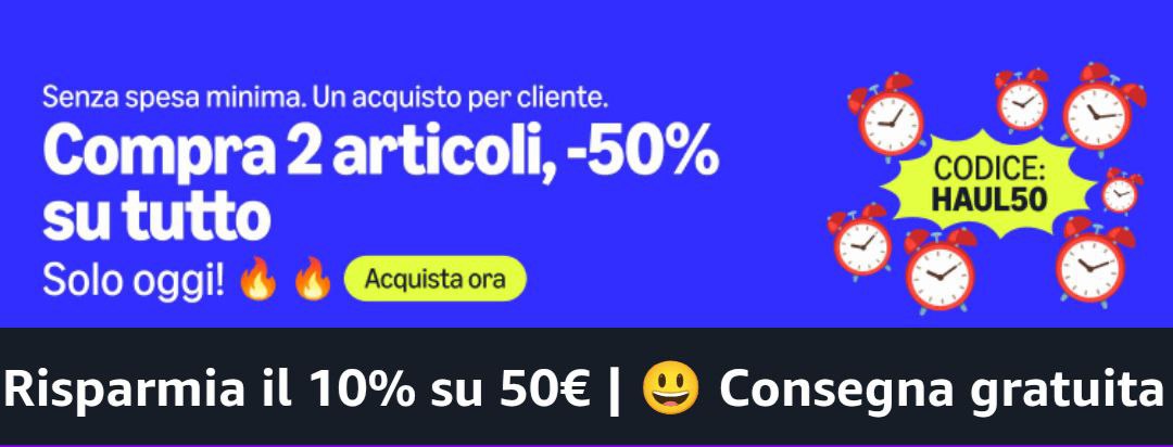 Acquistando due prodotti della pagina haul ottieni il 50% di sconto al checkout utilizzando il codice: