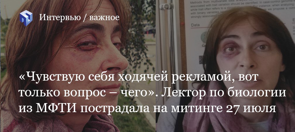 Одной из пострадавших на несогласованном митинге 27 июля стала Виктория Скобеева – кандидат биологических наук, научный сотрудник МГУ и лектор по общей биологии на Физтехе. Двух ее коллег задержали, сама женщина получила дубинкой по лицу.