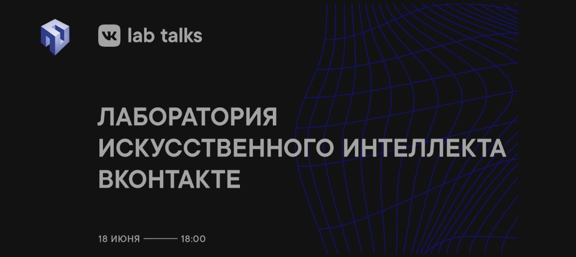 18 июня в 18:00 по московскому времени пройдёт семинар от Лаборатории искусственного интеллекта, VK Lab Talks. Для участия можно подключиться к трансляции в день мероприятия в сообществе VK lab или же в Потоке, где тоже будет доступен плеер трансляции.