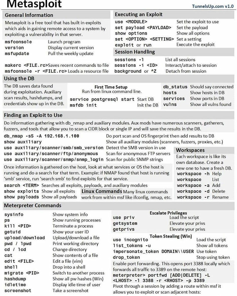 Сегодня делимся с вами небольшой шпаргалкой по метасплойту. Ничего особенного - наиболее часто используемые команды, но почему-то их все время забываешь. А тут все под рукой