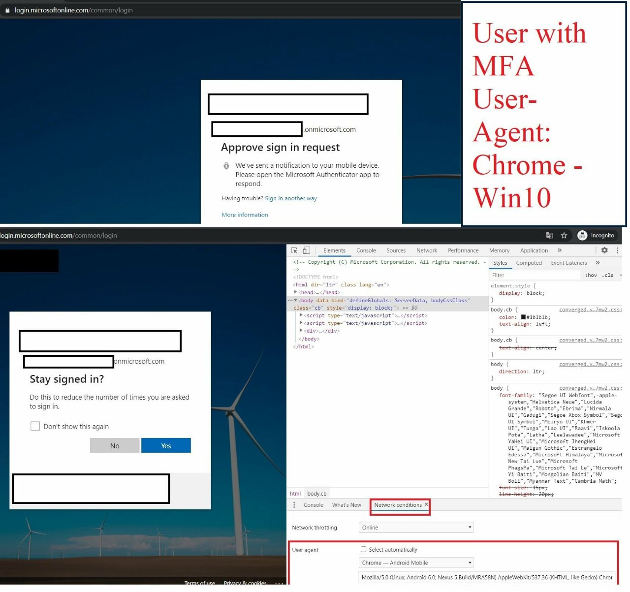 На картинке приведен пример неправильно настроенного условного доступа у заказчика. При смене user-agent на мобильный второй фактор не запрашивается. Да, для сотрудников заказчика это удобно. Но это также удобно и для злоумышленника.