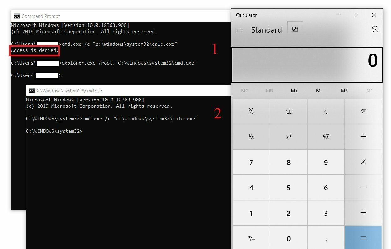 Но есть другой способ. Через explorer.exe можно запустить cmd.exe и уже из нового окна запустить calc.exe изначально планируемой командой (см часть рисунка под цифрой 2). И исполняемый файл запустится без каких-либо вопросов. Таким образом можно обойти запрет на запуск исполняемого файла через cmd.exe под непривилегированным пользователем.