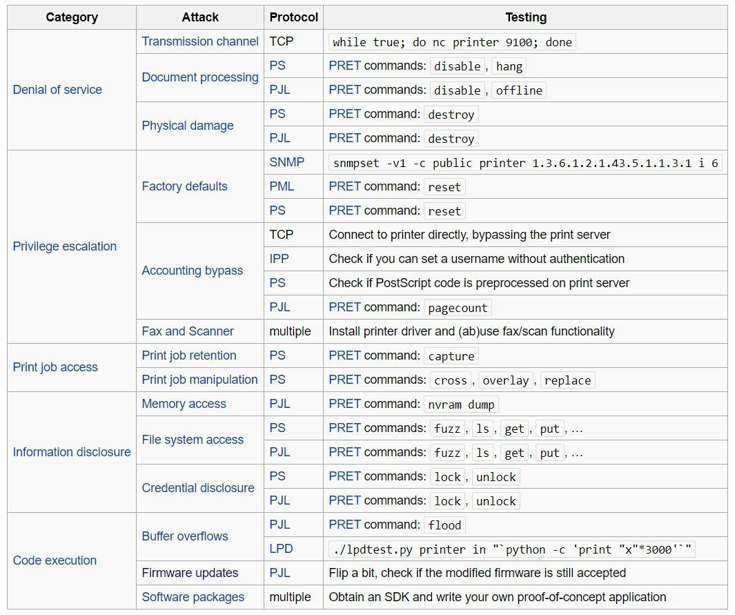 На картинке представлена небольшая шпаргалка по тестированию безопасности принтера. Она составлена с использованием команд PRET для проверки, но можно просто взять за основу варианты атак и самим придумать проверки для них.