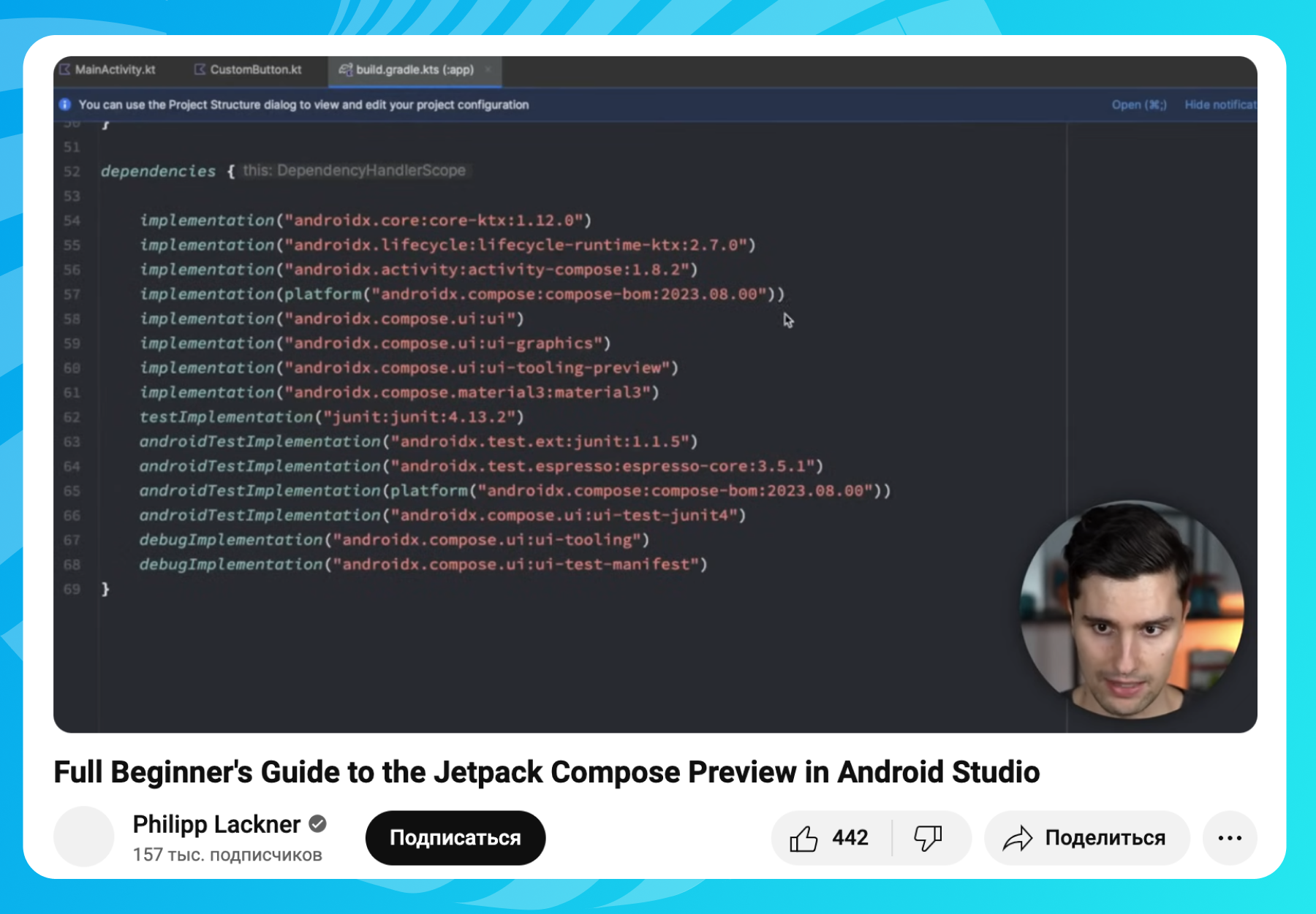 Видео-гайд с инструкцией как обновить Gradle для использования последней версии Compose, и как настроить базовый предпросмотр для функции composable на примере пользовательской кнопки.