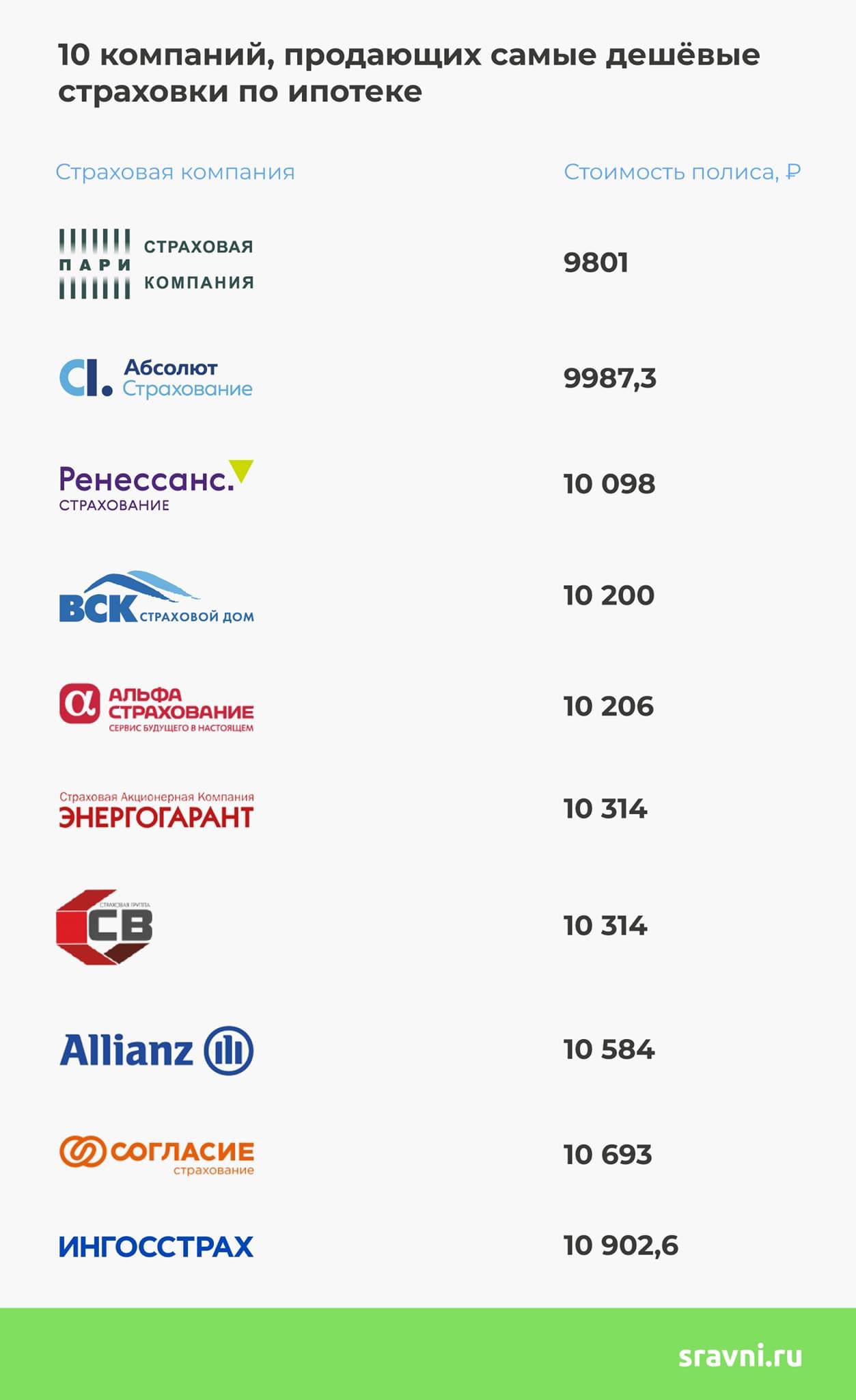 В табличке - 10 самых дешёвых страховок для среднестатистического заёмщика, который должен банку 2,7 миллиона ₽.