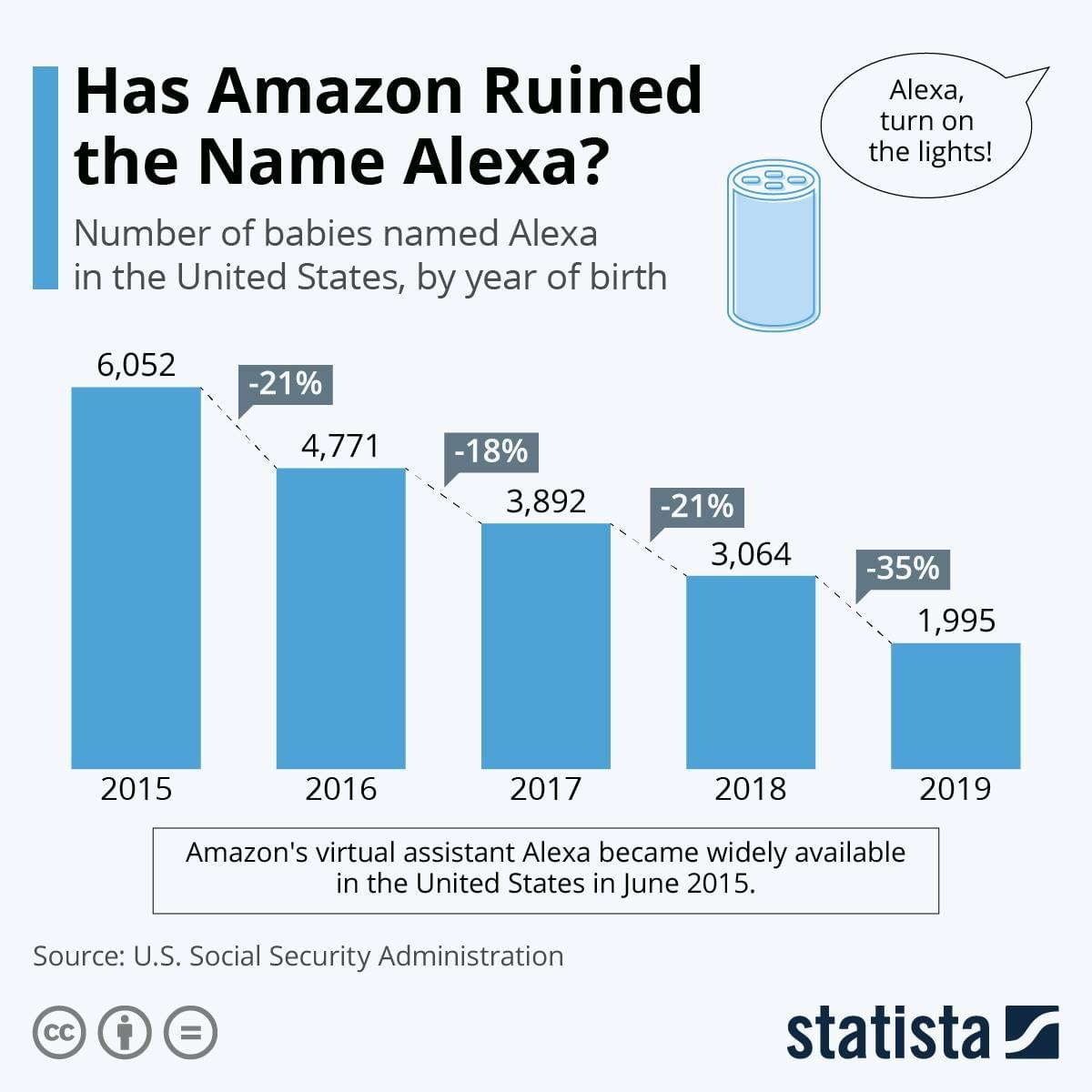 Обожаю такие истории. Во «Фрикономике» была целая глава про то, как разные большие события влияют на популярность имён для новорожденных. И вот продолжение. В 2015 году Amazon запустил голосового помощника Alexa. И с тех пор количество названных этим именем девочек неуклонно снижается. К 2019 году оно упало в 3 раза.