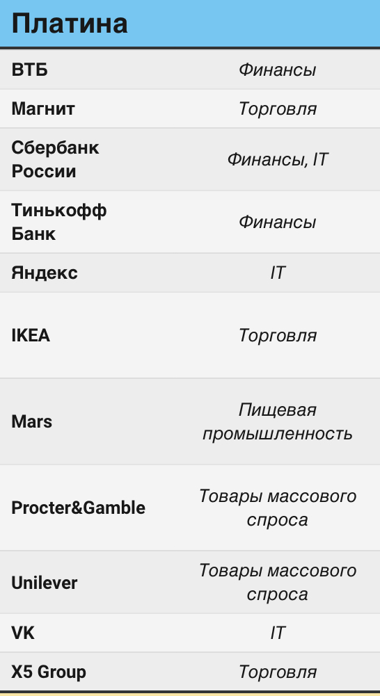 Всего в список вошло 104 компании. Как таковых мест в рейтинге нет: работодатели разделены по статусу «Платина», «Золото», «Серебро» и «Бронза» в зависимости от набранных баллов. Для оценки учитывался не только соцпакет, средние зарплаты и условия труда, но и экологический след компаний и их влияние на общество.