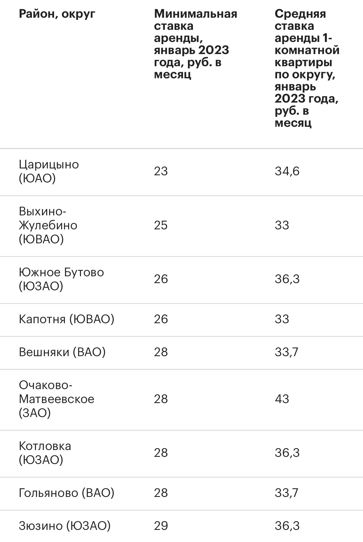 В среднем, самые дешевые квартиры сейчас нужно искать в Выхино-Жулебино (кстати, там, не так ужасно, как принято думать) и в Капотне (а вот там кошмар!). Аренда однушки в обоих районах в среднем обойдётся в 33 000 ₽.