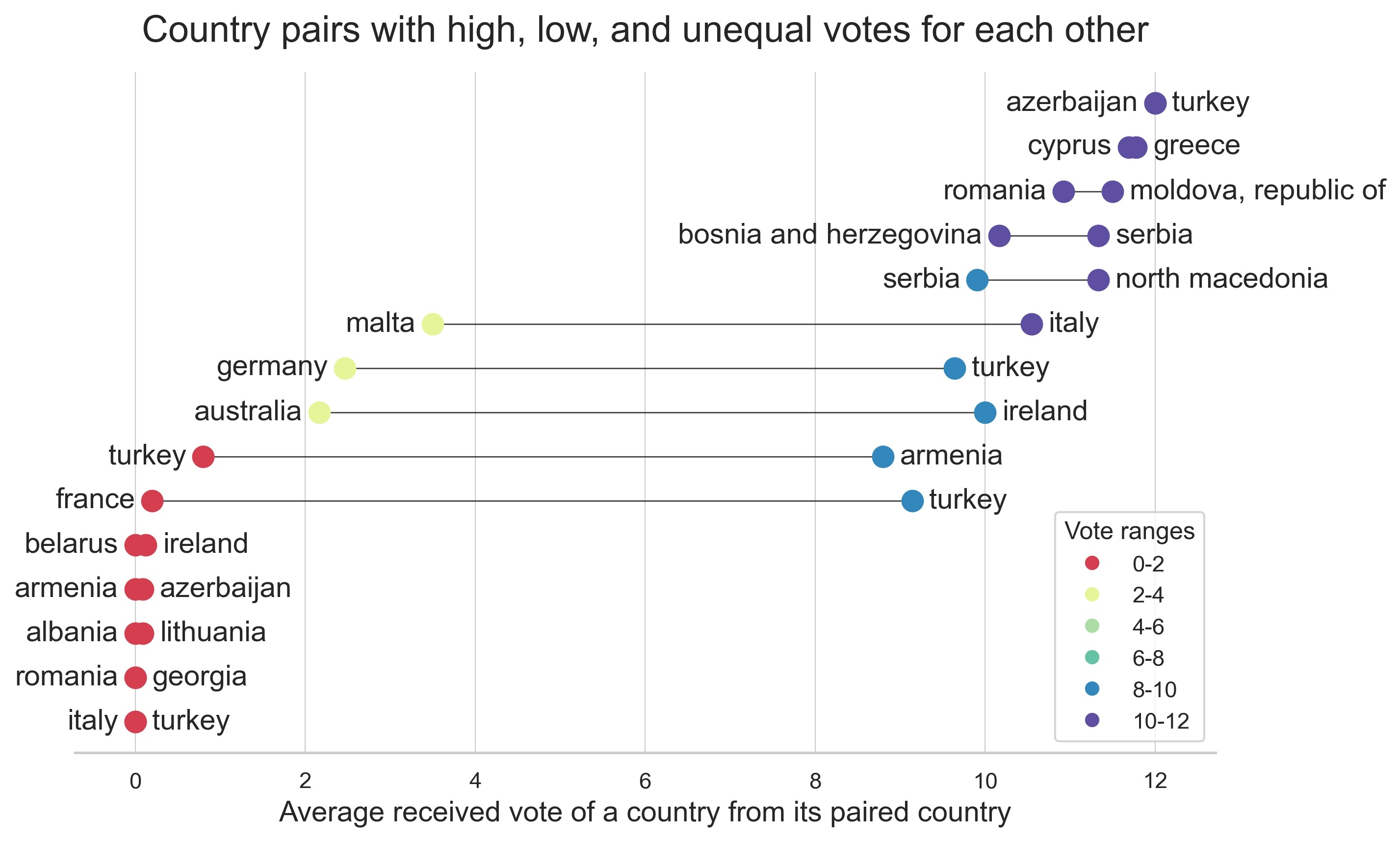 Ещё учёные проверили, действительно, ли страны дают высокие баллы соседям. Закономерности есть, но не всегда логичные. Например, сладкие палочки Греция и Кипр и Турция с Азербайджаном всегда дают друг другу по 12 баллов, а Азербайджан и Армения, у которых застарелый конфликт по поводу Нагорного Карабаха — никогда не оценивают соседа выше 2 баллов. Но, например, Франция хронически ставит Турции 8-10 баллов, а та в ответ — 0-2 балла.
