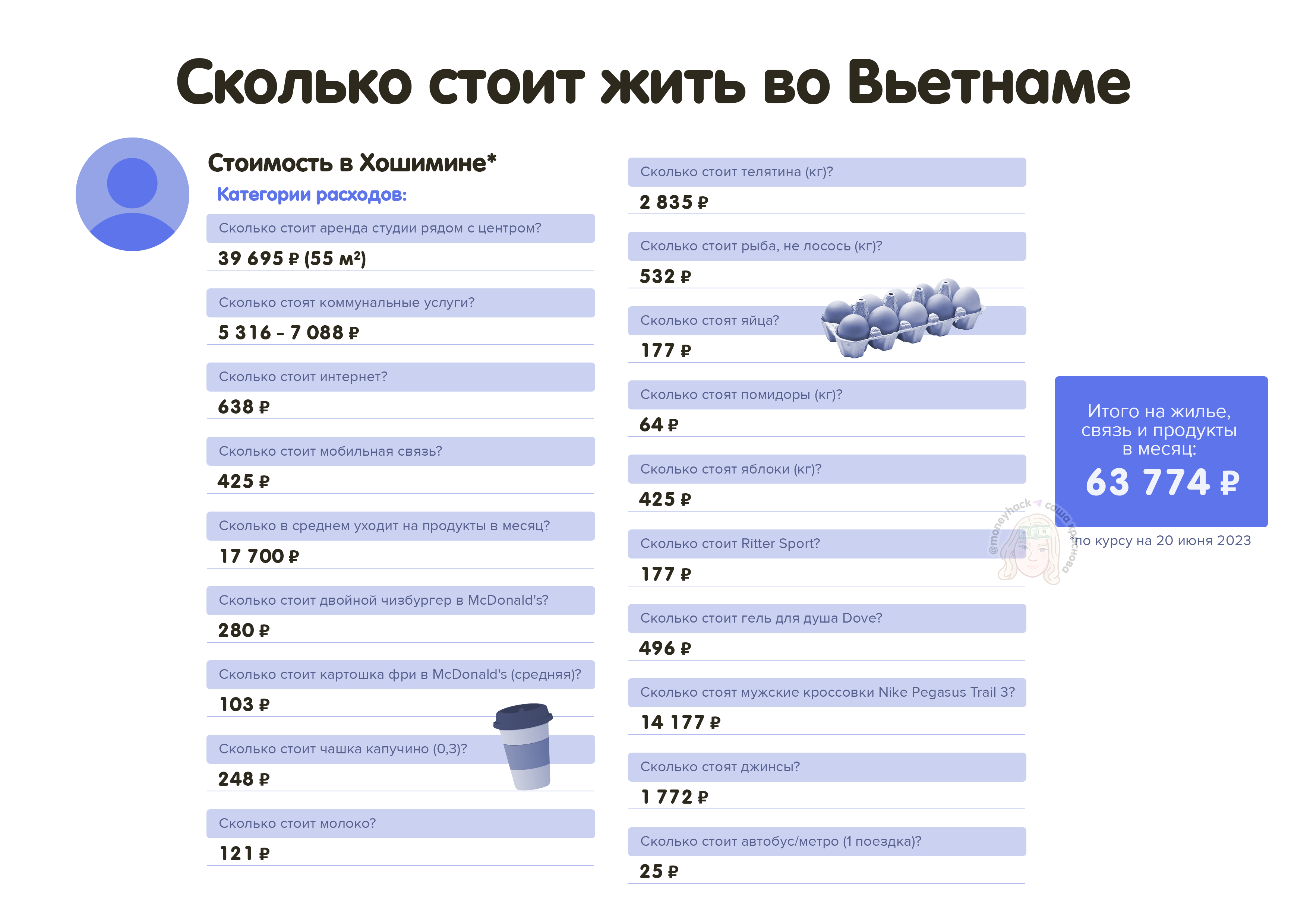 По данным Numbeo, ежемесячная стоимость жизни в Хошимине (это крупнейший город страны) составляет в среднем 44 275 ₽ без учета аренды на одного человека. Снять однокомнатную квартиру в центре можно примерно за 44 400 ₽. Но моей читательнице Ирине это удается дешевле.