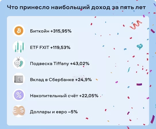 Спустя 5 лет результаты выглядят по-другому. Биткойн все ещё самый доходный (но только по тому, что был куплен в удачный момент), ETF - тоже довольно прибыльный. Но только в теории. Весной 2022 года торги фондами FinEx ETF на Московской бирже были приостановлены — и вряд ли начнутся до снятия санкций с российского депозитария НРД. Так что эта инвестиция стала зависшем не пойми где богатством.