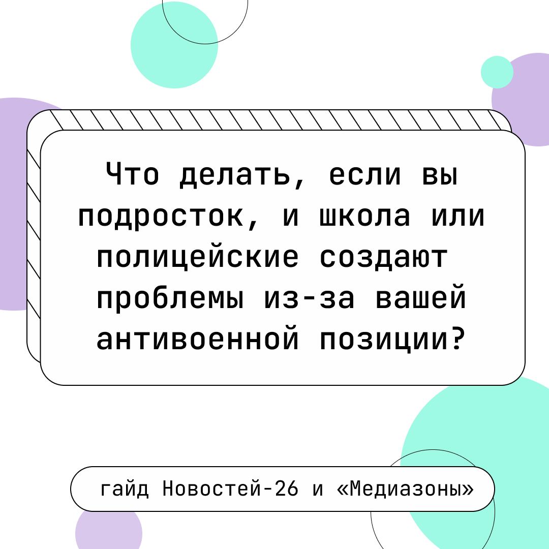 Помните, мы говорили о том, что ваша безопасность — превыше всего, и что, на наш взгляд, всегда стоит хорошо взвесить, с кем и в каких обстоятельствах мы делимся тем, что мы действительно знаем и думаем о войне и о происходящем в России? Мы очень надеемся, что вы твердо знаете, кому и когда доверять, а кому и когда — нет. Но вдруг все-таки случается так, что из-за вашего мнения о войне и вообще о российской политике у вас начинаются неприятности, — от вызова к директору до задержания полицейскими? Наши коллеги из «Медиазоны», независимого издания, помогающего людям защищать и отстаивать свою свободу, вместе с нами составили для вас гид из 4 ситуаций: что может случиться и как себя вести. Вот он. Нам кажется, что его стоит прочесть очень внимательно, а местами даже заучить, — и при этом мы надеемся, что он никогда вам не пригодится.