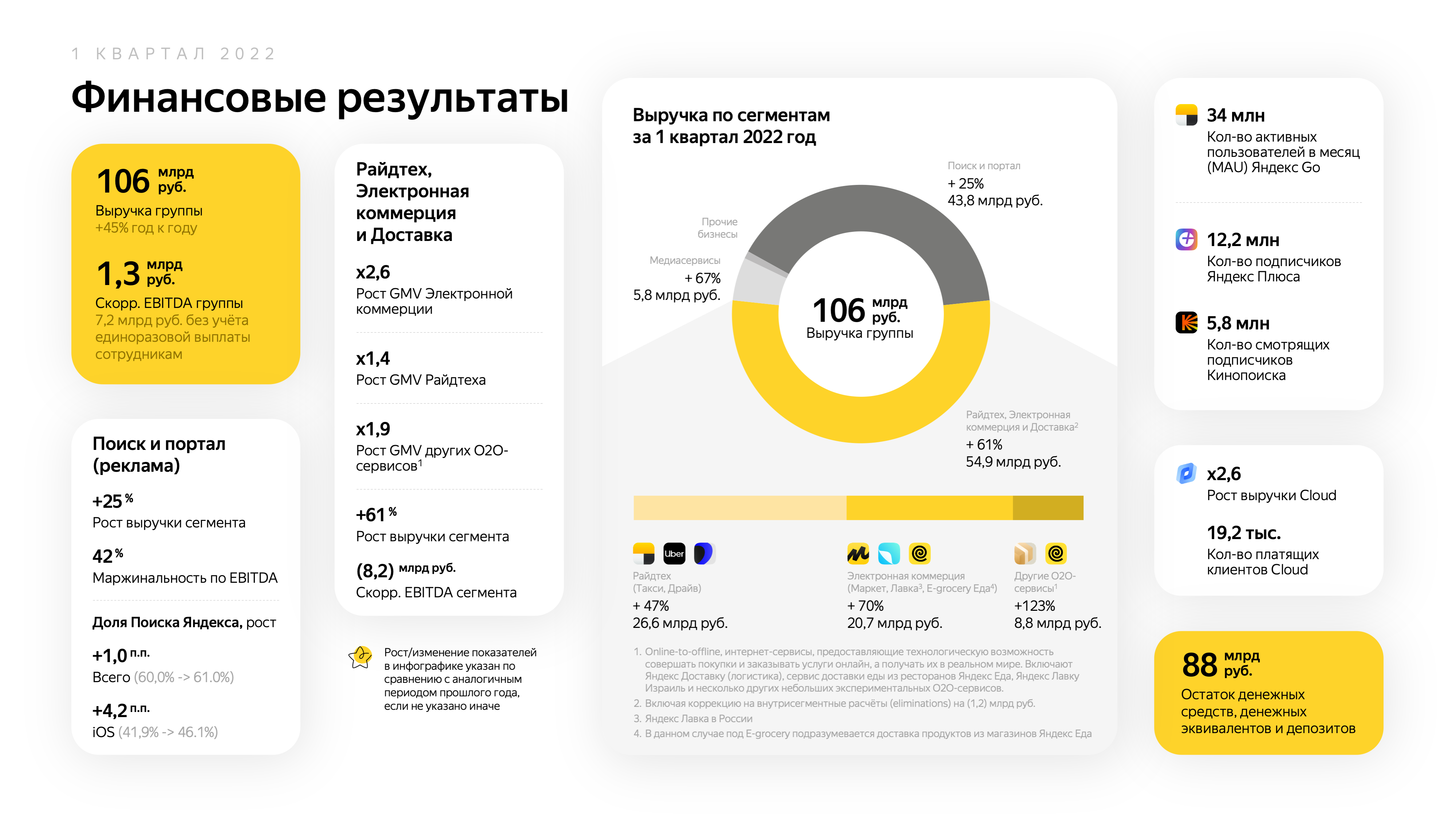 - Товарооборот (GMV) сегмента E-commerce в Q1 2022 вырос на 164% по сравнению с Q1 2021 и составил 64,6 млрд руб. Этот сегмент включает Маркет, доставку продуктов в Еде и Лавку в России.