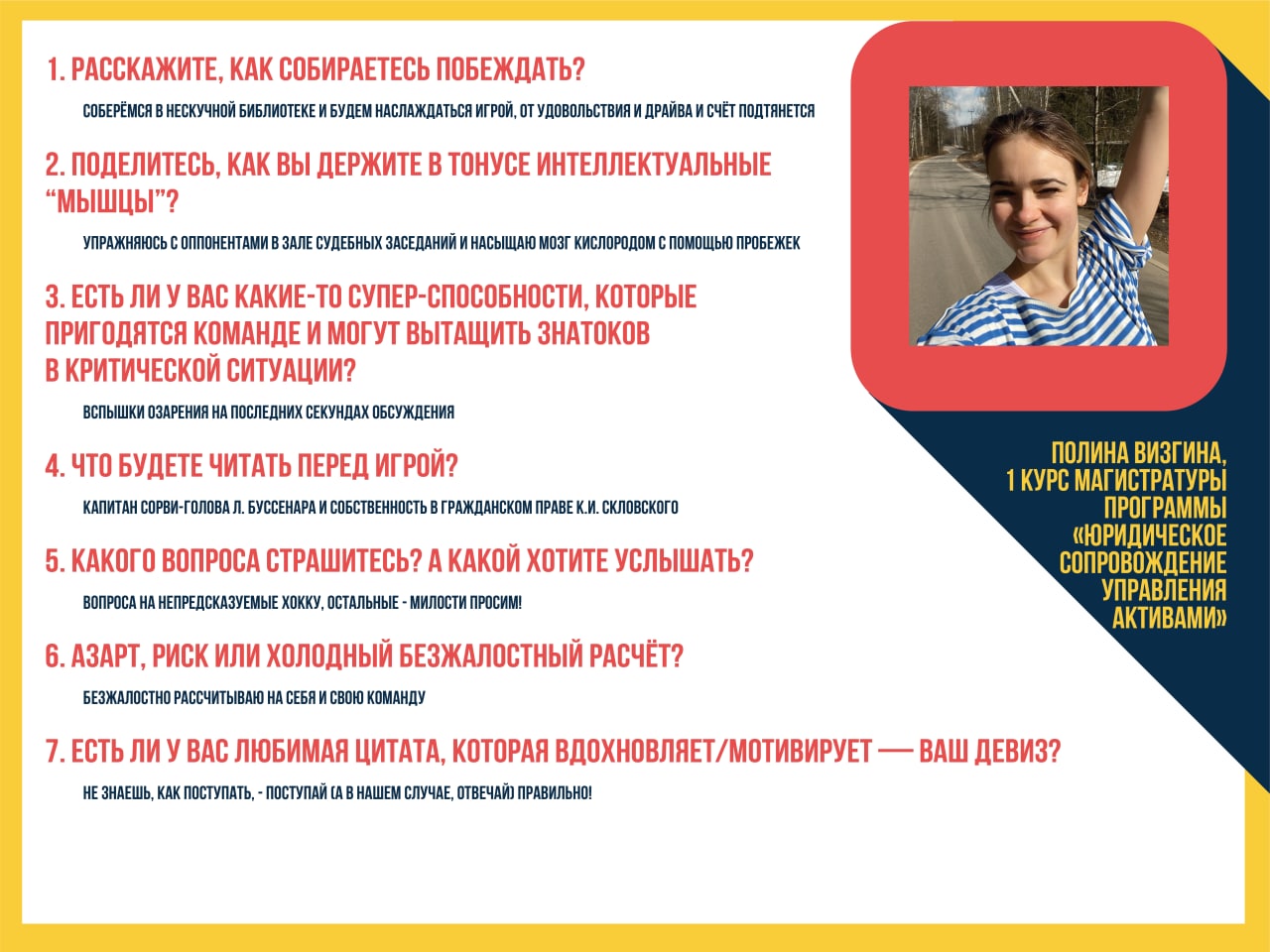 Полина из тех людей, кого неожиданно озаряет в последние секунды перед ответом. Собирается наслаждаться игрой, всецело полагается на команду, а, готовясь к поединку, сражается с оппонентами в зале судебных заседаний.