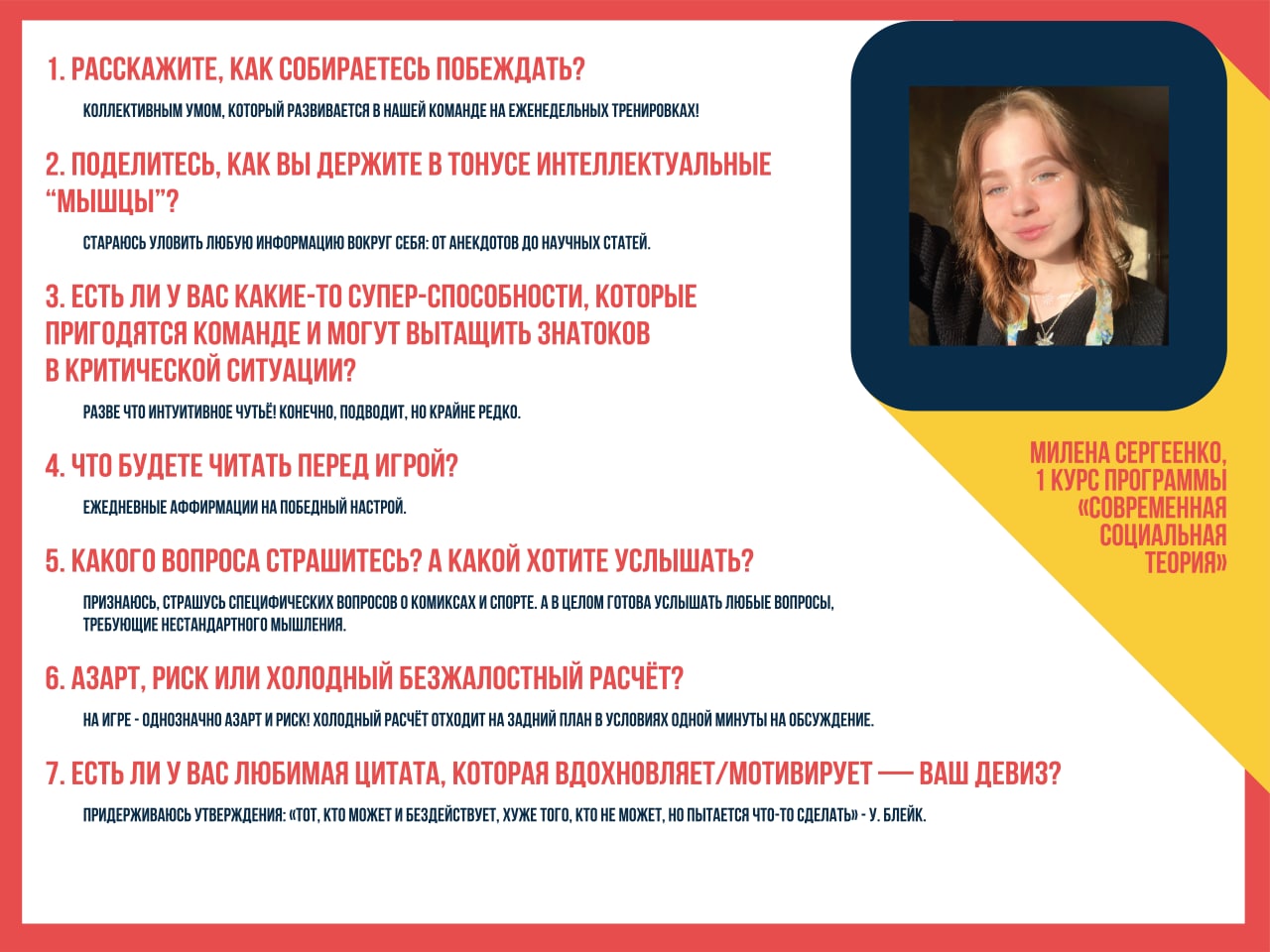 Представляем пятого знатока второй команды Што? Где? Когда? — Милена Сергеенко, студентка 1 курса программы "Современная социальная теория".