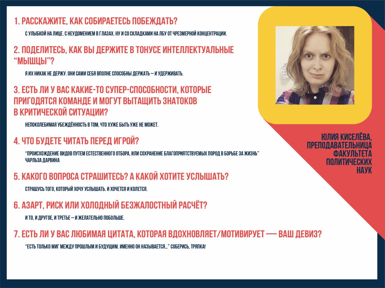 Время представить вам следующего знатока третьей команды ШГК — Юлию Киселеву, преподавательницу факультета политических наук.