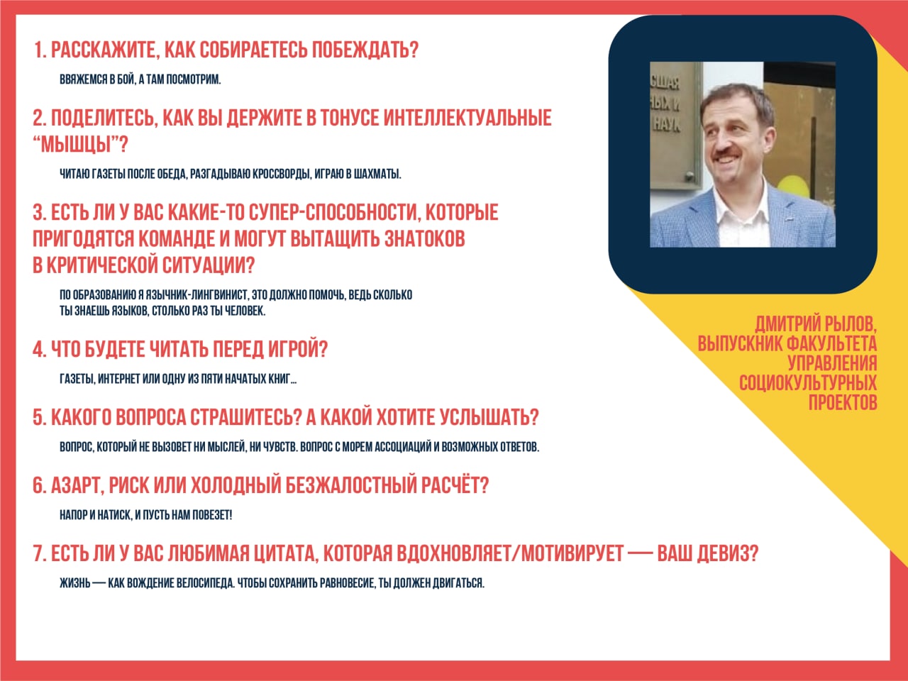 Еще один знаток третьей команды Што? Где? Когда? — выпускник факультета УСКП и язычник-лингвинист Дмитрий Рылов!