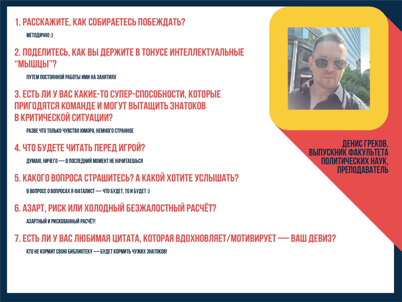 Представляем вам еще одного знатока команды Алины Петровой — это Денис Греков, выпускник факультета политических наук и преподаватель. Денис собирается побеждать методично (that's the spirit!), собирается полагаться на собственное чувство юмора и азартный и рискованный расчет.