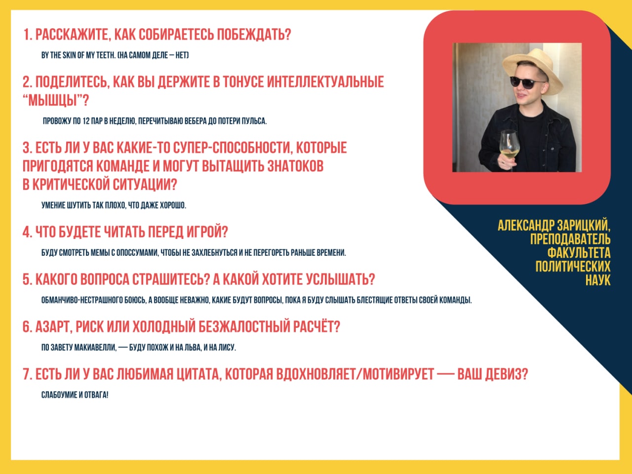 Представляем вашему вниманию еще одного из уважаемых знатоков первой команды "Што? Где? Когда?": Александр Зарицкий, преподаватель факультета политических наук.