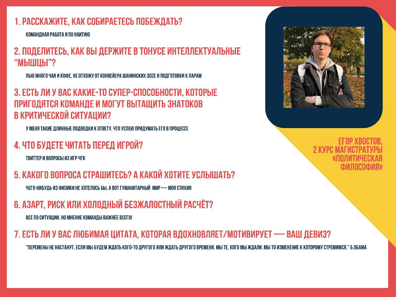 Представляем вам последнего знатока из первой команды Што? Где? Когда? — Егор Хвостов, студент 2 курса магистратуры "Политическая философия".