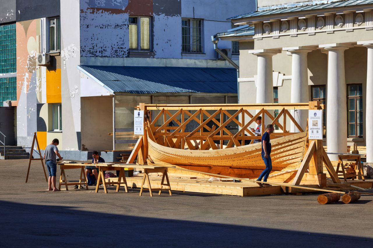Временная верфь была устроена во внутреннем дворе Музея Москвы на Зубовском бульваре.