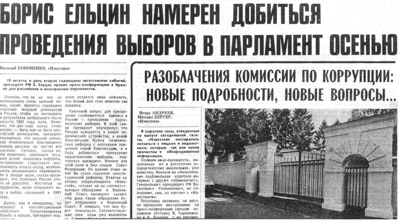 "Известия" на первой полосе помещают два тематически связанных материала: Президент Б.Н.Ельцин на пресс-конференции 19 августа, посвященной годовщине "победы демократии", признал, что ошибся, не настояв на перевыборах народных депутатов РСФСР осенью 1991-го, и пообещал провести выборы нового парламента осенью 1993-го; адвокат Андрей Макаров от имени Межведомственной комиссии по борьбе с коррупцией обвинил в коррупции вице-президента РФ Александра Руцкого и генерального прокурора Валентина Степанкова. Из материала, кстати, ясно, что корреспонденты "Известий" никаких подтверждений обвинениям Макарова не нашли, поэтому в тексте появились многозначительные намёки: дескать, дело окружено таинственностью...