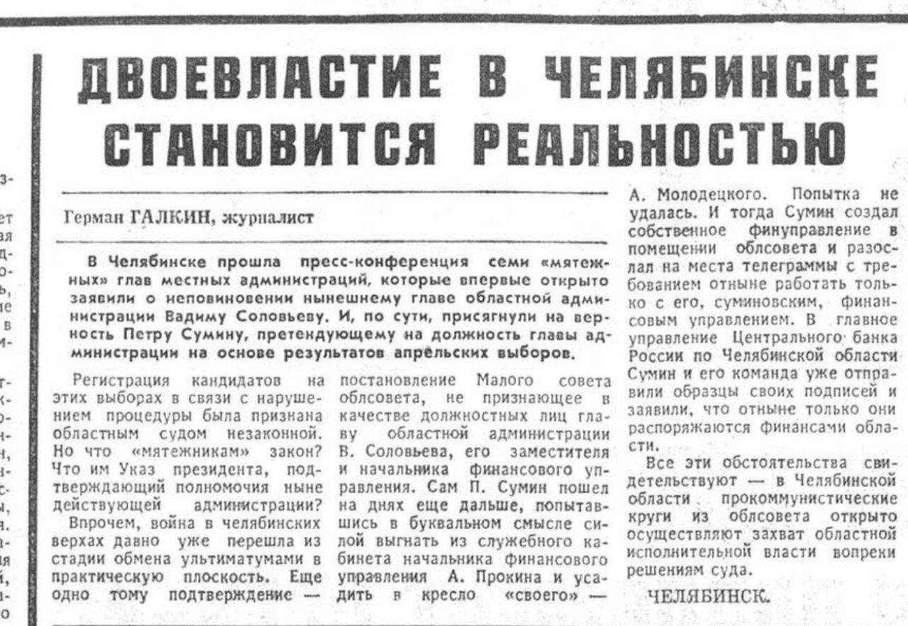 Признаться, мы уже и подзабыли, до какой степени уже в 1993 году солидная пресса не брезговала враньём и передёргиваниями. Но вот примечательный образчик: коротенькая заметка "Известий" о двоевластии в Челябинской области. Сообщение о факте (7 глав территориальных администраций области провели пресс-конференцию, на которой заявили о подчинении избранному главе администрации области Петру Сумину и непризнании полномочий назначенного главы администрации области Валерия Соловьёва) сопровождено сразу тремя передержками. Написано, что областной суд признал регистрацию кандидатов на апрельских выборах незаконной - но не написано, что Верховный суд РФ отменил решение облсуда и что Конституционный суд РФ признал выборы законными. Написано, что Президент Б.Н.Ельцин своим указом подтвердил полномочия Соловьёва - но не написано, что Конституционный суд РФ постановил, что Президент в этом случае "вышел за пределы своих полномочий, закрепленных в статье 121.5 Конституции Российской Федерации". Пётр Сумин назван коммунистом, ибо он бывший первый секретарь Челябинского обкома КПСС - но не сказано, что Валерий Соловьёв - бывший первый секретарь Челябинского горкома КПСС.