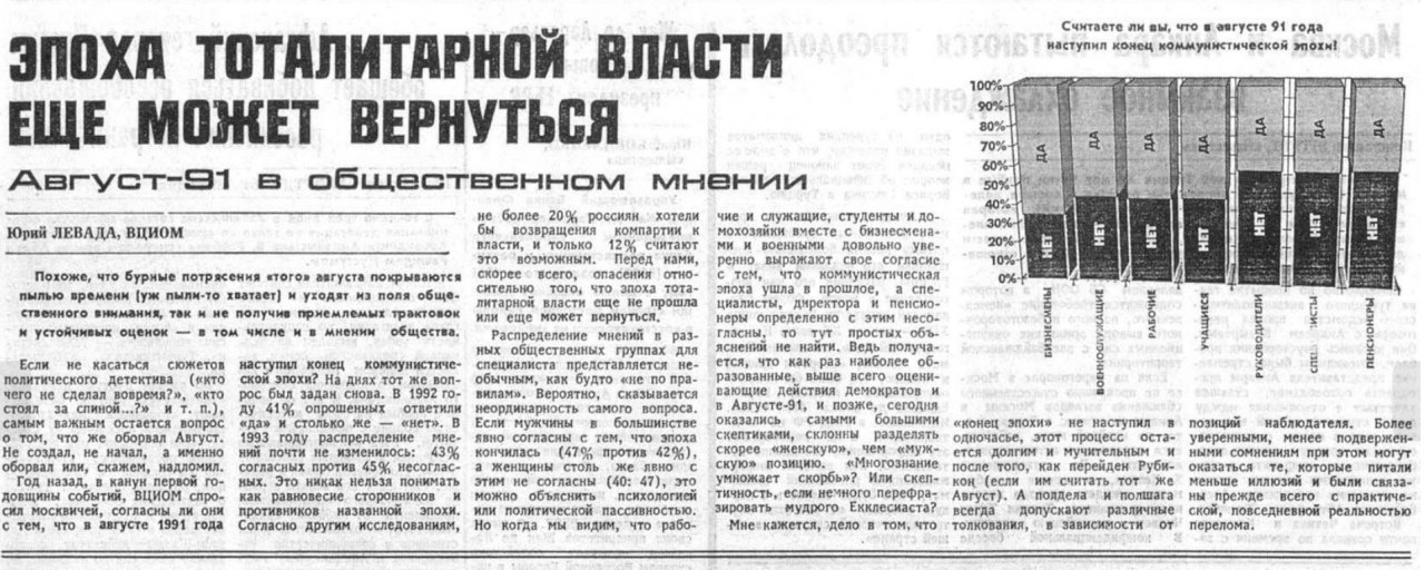 Юрий Левада от имени ВЦИОМ пугает читателей со страниц "Известий" коммунистическим реваншем. Оказывается, на вопрос "Согласны ли вы с тем, что в августе 1991 года наступил конец коммунистической эпохи?", 43% опрошенных ВЦИОМ сказали "да", а 45% - "нет". Следовательно, тоталитаризм может вернуться...