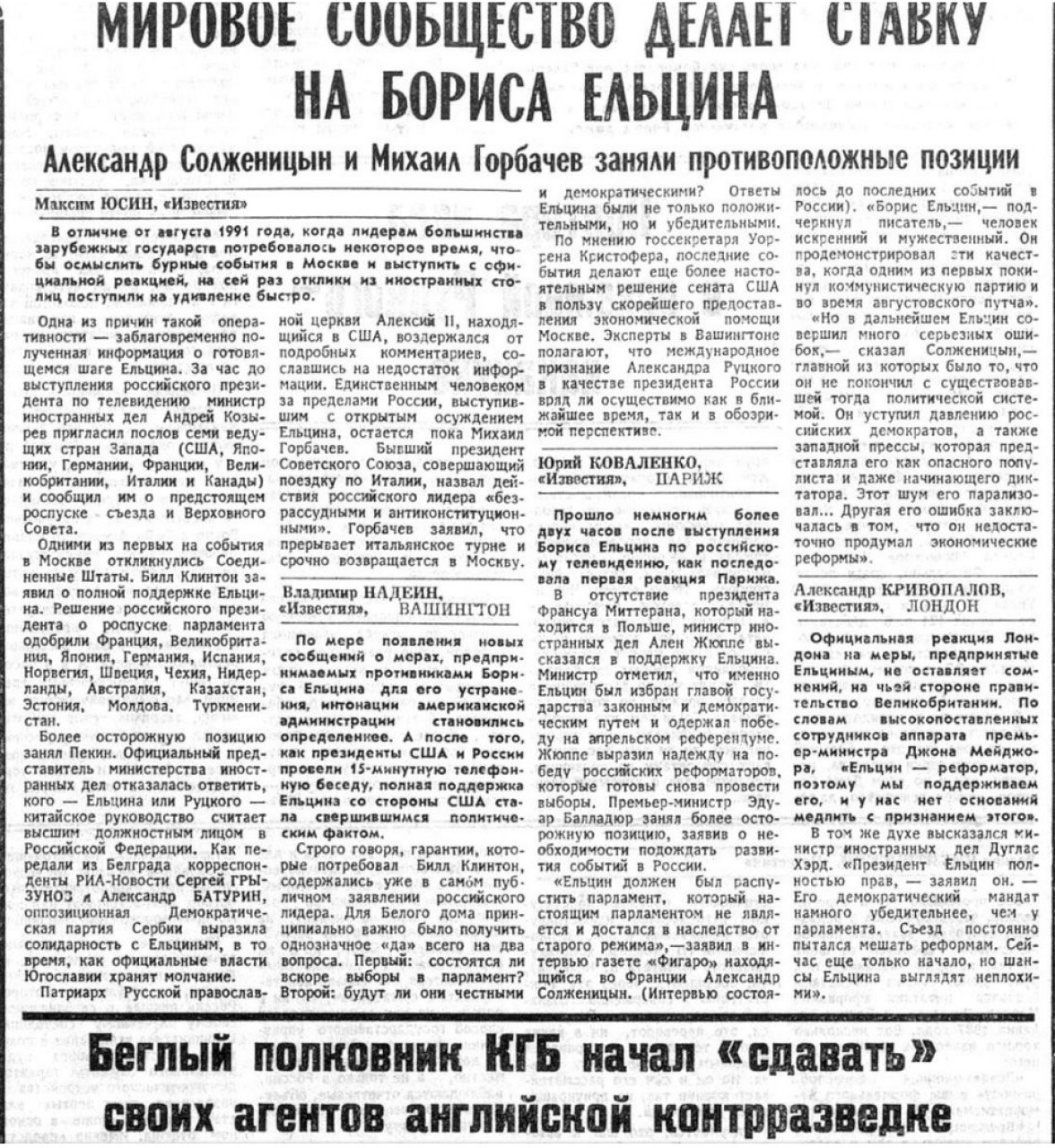 На пятой полосе "Известий" подборка зарубежных новостей. Весь мир за Ельцина! Рядом сообщение о ещё одной победе демократии: отставной полковник КГБ сбежал в Англию и разоблачает шпионскую сеть. Мы не издеваемся, редакция именно так подаёт событие, не забывая вставить строку про "крах партийно-кагэбешных структур".