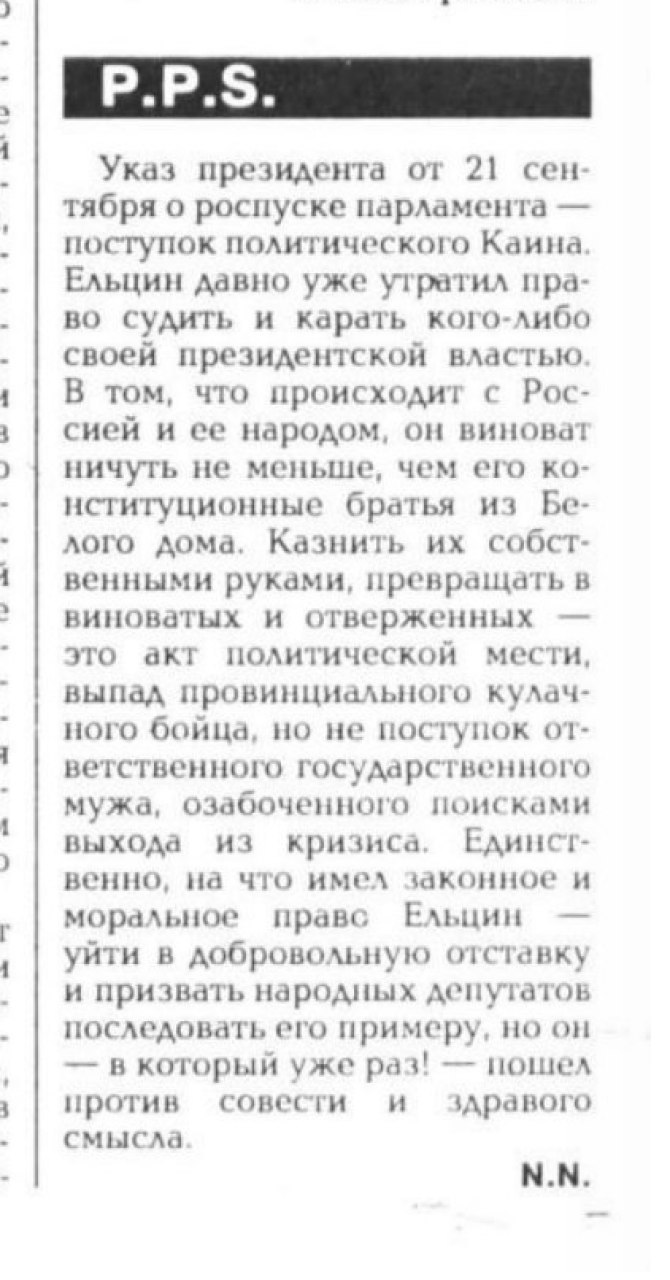 Листая старые газеты, иногда невольно удивляешься причудам судеб. Так, 23 сентября "Независимая газета" идёт на в высшей степени неординарный шаг: печатает обширную (две трети полосы) статью на острую политическую тему, подписанную инициалами N.N. В редакционной вводке пояснение: имя автора известно редакции. В другой день такая статья стала бы сенсацией даже независимо от своего содержания. Но 23 сентября 1993 года она проходит совершенно незамеченной. И даже нам, фанатам, так сказать, старых газет, сегодня её содержание по барабану. Нам интересен лишь коротенький пост-пост-скриптум, где аноним называет Ельцина "политическим Каином".