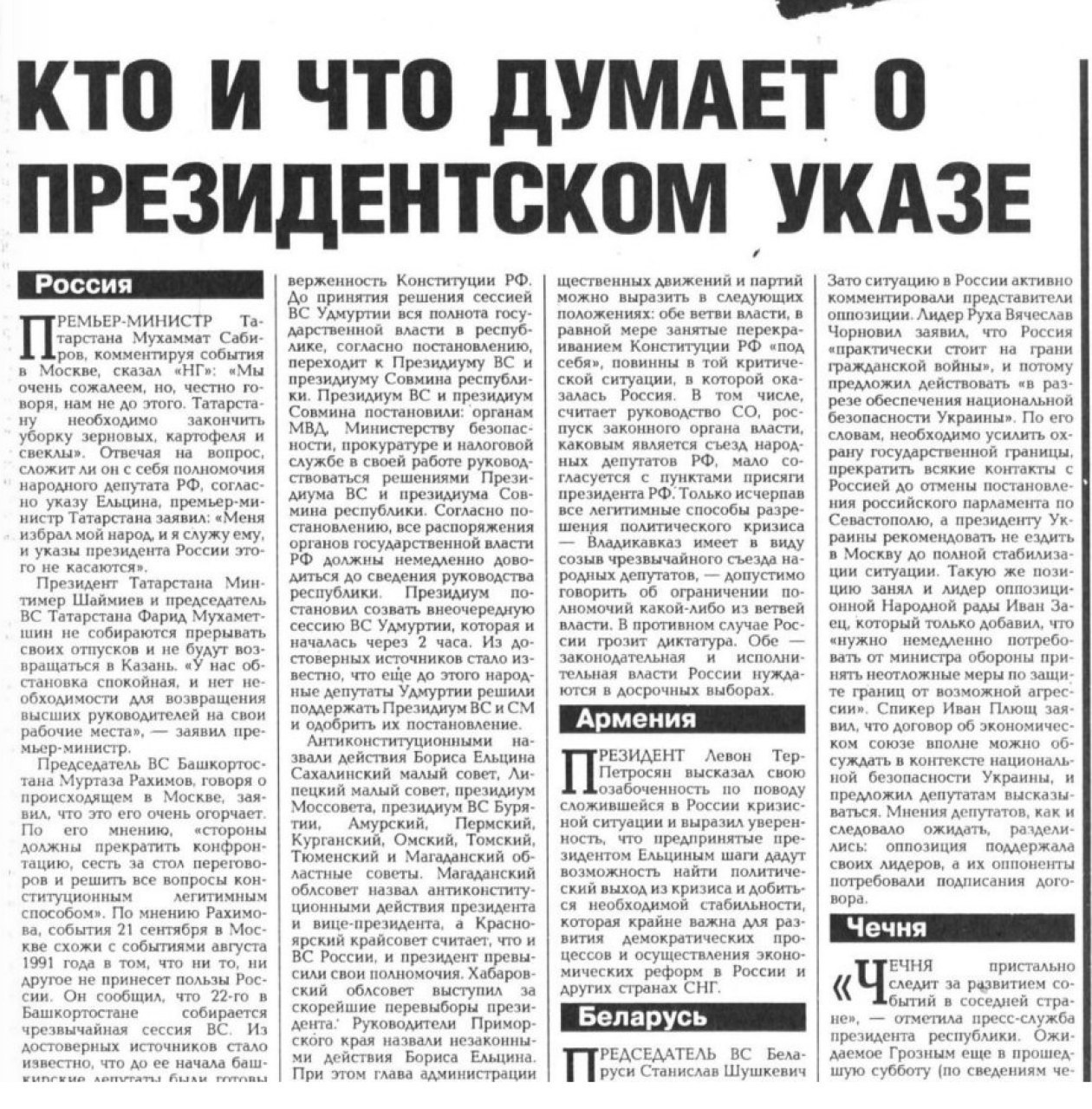 "Независимая газета" публикует подборку откликов на указ №1400: кто-то за Ельцина, кто-то против. Плюрализм мнений... Джохар Дудаев, в частности, хвалит Ельцина: дескать, перенял передовой чеченский опыт.