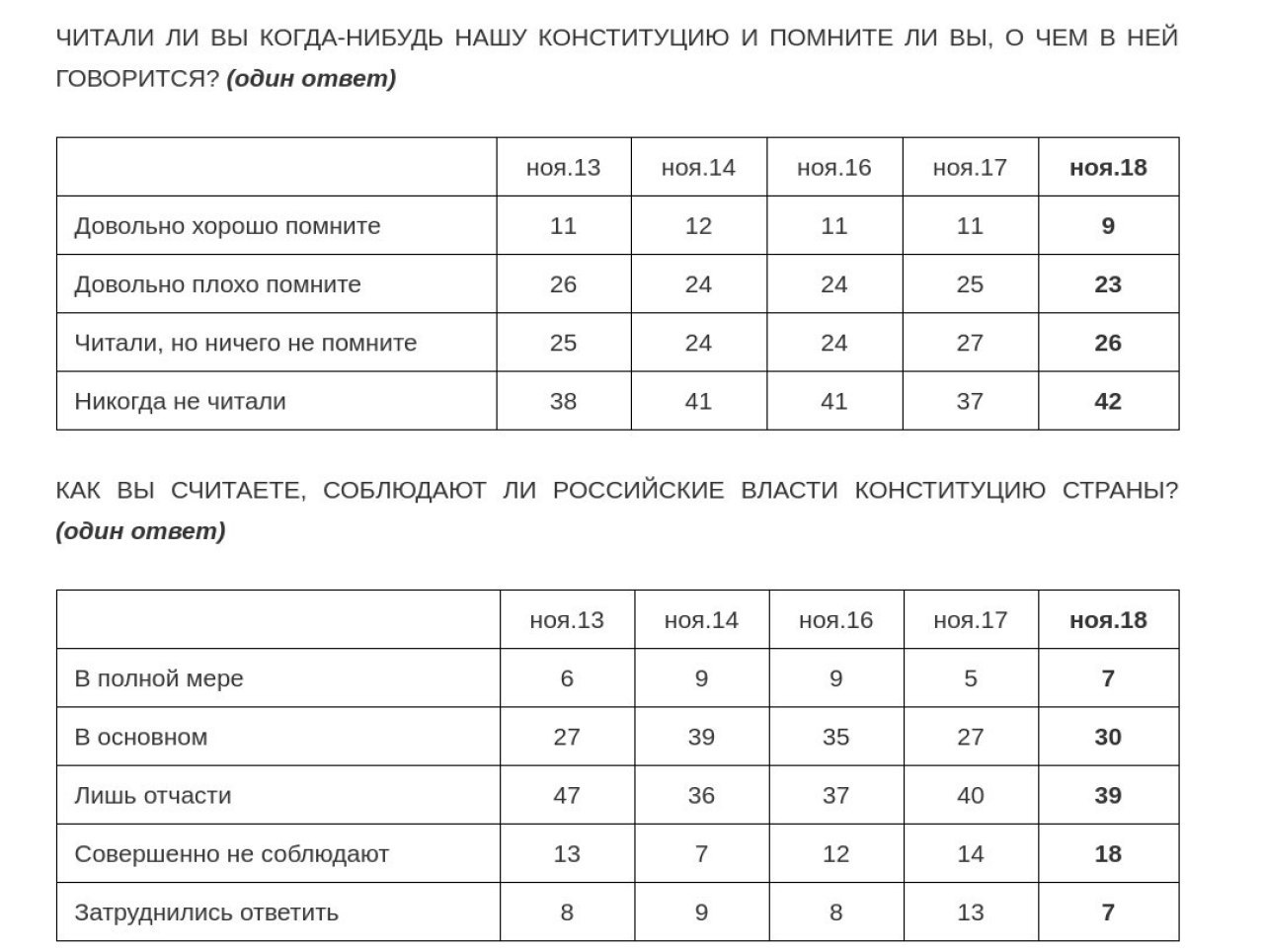 К сожалению, формат публикации не предусматривает кросс-таблиц. А ведь было бы очень интересно посмотреть, как множество незнакомых с содержанием Конституции (68% опрошенных) пересекается с множеством считающих, будто власти Конституцию не соблюдают (57%). Ведь не пересекаться они не могут!