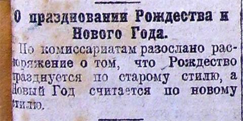 В этот день 100 лет назад в 1918 году петроградская "Красная газета" поместила разъяснение, как праздновать Рождество Христово и Новый год: "По комиссариатам разослано распоряжение о том, что Рождество празднуется по старому стилю, Новый Год считается по новому стилю."