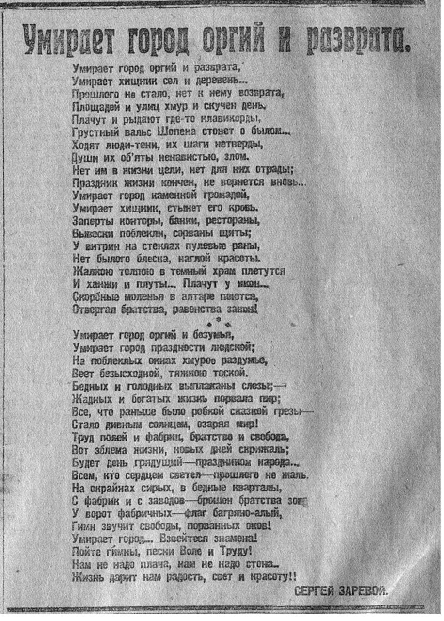 Сергей Заревой - вовсе не юноша бледный со взором горящим (как можно было бы подумать), а 40-летний присяжный поверенный Сергей Николаевич Кошкаров. Уроженец Саратова, учился в Ярославле в Демидовском юридическом лицее, служил по министерству юстиции, выслужив ценз, вступил в адвокатуру, переехал в Москву. Первый сборник стихов и басен выпустил в 1902 году, всего до революции издал более 30 книг стихов. После Октябрьской революции вступил в РКП(б), сотрудничал в "Известиях", "Бедноте", РОСТА. Направлен ЦК РКП(б) редактором партийной газеты на Восточный фронт, где и умер от тифа 27 ноября 1919.