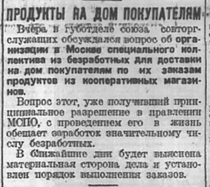 Недавно мы (с помощью вырезки из "Вечерней Москвы" 1929 года) вспоминали, как 90 лет назад готовилось введение хлебных карточек в столице. Сегодня вырезка из "Вечерней Москвы" 1927 года (последнего года нэпа) напоминает нам, что 92 года никаких проблем с продовольствием не было, обсуждался вопрос об организации в Москве специального коллектива из безработных для доставки на дом покупателям по их заказам продуктов из кооперативных магазинов. Работа в доставке дала бы "заработок значительному числу безработных". Увы, всего за 2 года социалистического строительства всё переменилось