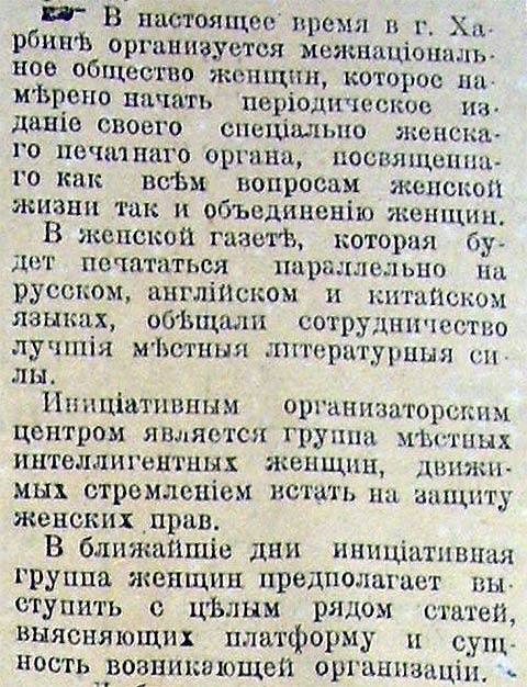 По данным электронного издания "Литературное наследие русской эмиграции в Китае" (главный составитель Ли Яньлин, 488 Гб - 2010 – 171 электрон. опт. диск (DVD-ROM), онлайн версии нет), "Женская газета" издавалась в Харбине на русском языке в 1923 году. Возможно, перед нами первый шаг на долгом пути.