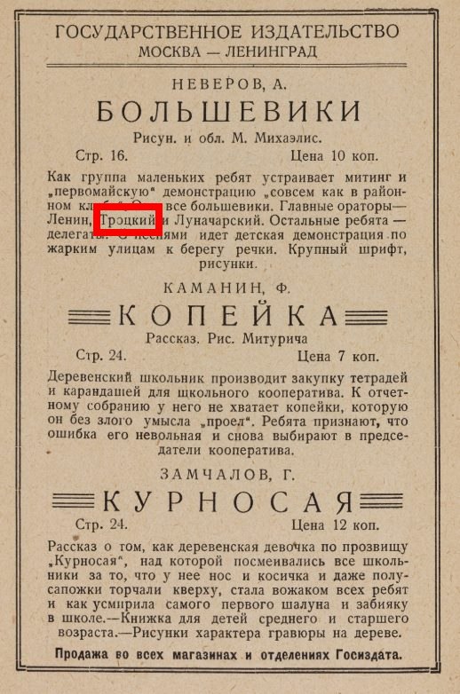Тут что странно. Троцкого выслали из СССР в 1929 году, причем в начале, а не конце года. Если бы высылка происходила в конце года, то можно было бы полагать, что книга вышла до события (поскольку выходящие в конце года книги традиционно помечаются следующим годом). Однако Троцкий оказался в Турции уже 12 февраля 1929. Уже в начале 1930 года в Собр.соч. Максима Горького, печатавшемся тем же Госиздатом, из очерка "В.И.Ленин" был выброшен похвальный отзыв Ленина о Троцком (письмо об этом председателя правления госиздата А.Халатова И.В.Сталину датировано 28 февраля 1930) . И вот оказывается, что примерно в то же самое время для детей печатается книжка с Троцким...