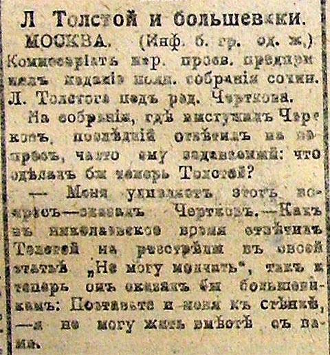 МОСКВА. (Инф. б. гр. од. ж.) Комиссариат нар. прос. предпринял издание полн. собрания сочин. Л. Толстого под ред. Черткова.